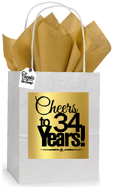 34th Cheers Birthday - Anniversary White and Gold Themed Small Party Favor Gift Bags Stickers Tags -12pack