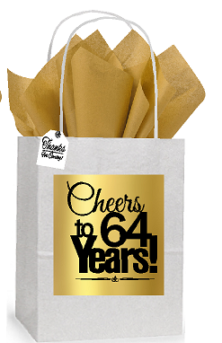 64th Cheers Birthday - Anniversary White and Gold Themed Small Party Favor Gift Bags Stickers Tags -12pack