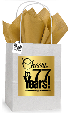 77th Cheers Birthday - Anniversary White and Gold Themed Small Party Favor Gift Bags Stickers Tags -12pack