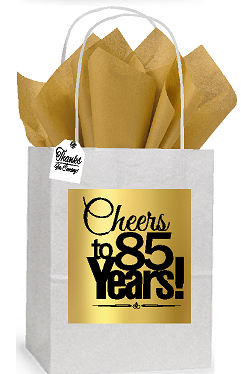 85th Cheers Birthday - Anniversary White and Gold Themed Small Party Favor Gift Bags Stickers Tags -12pack