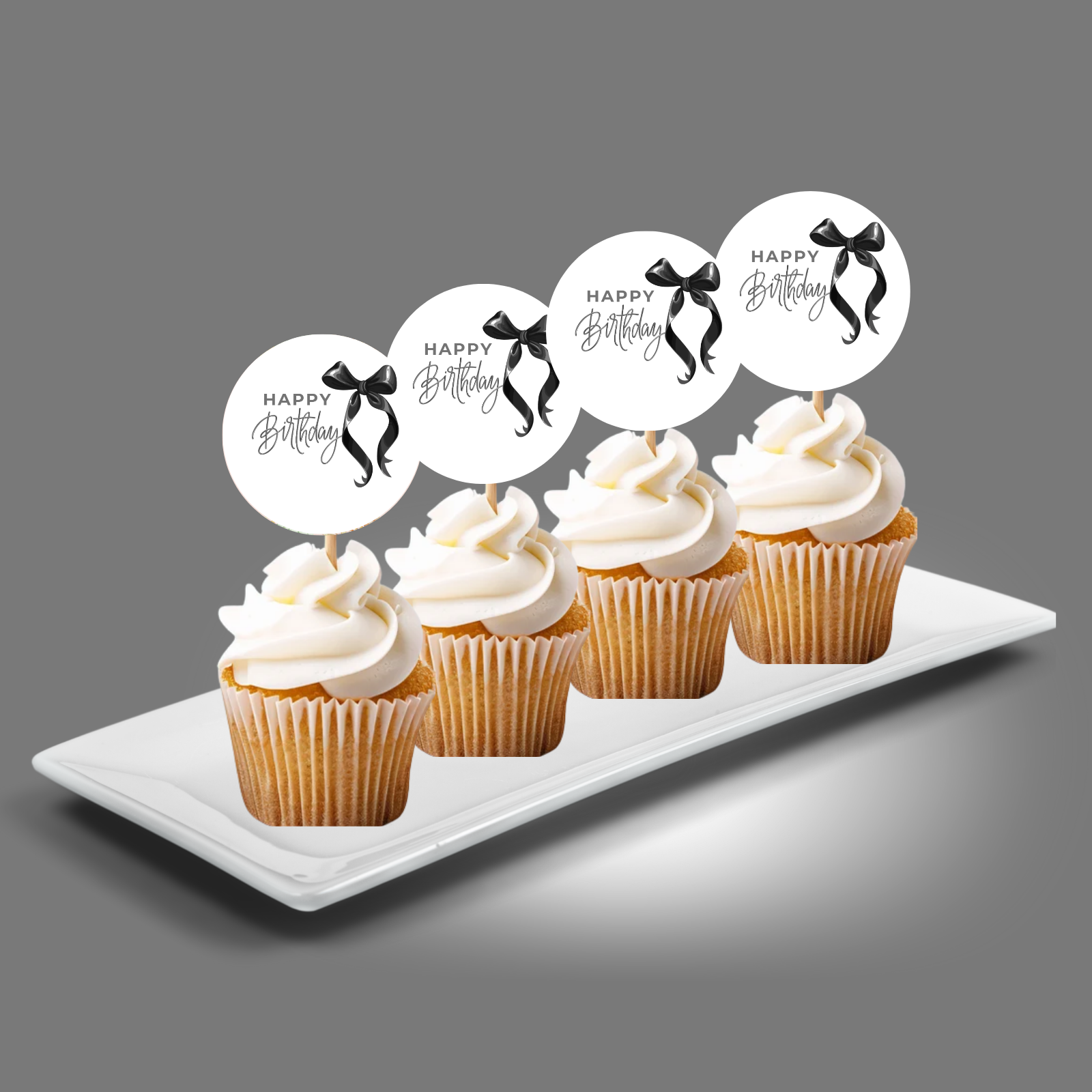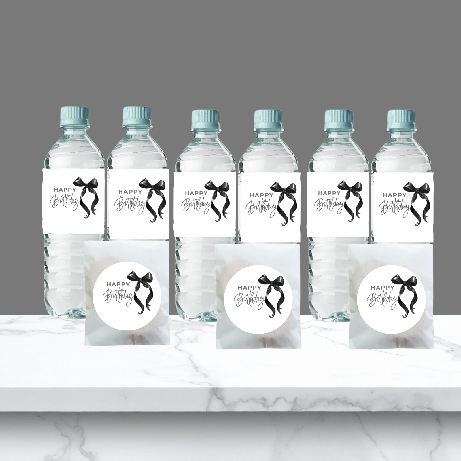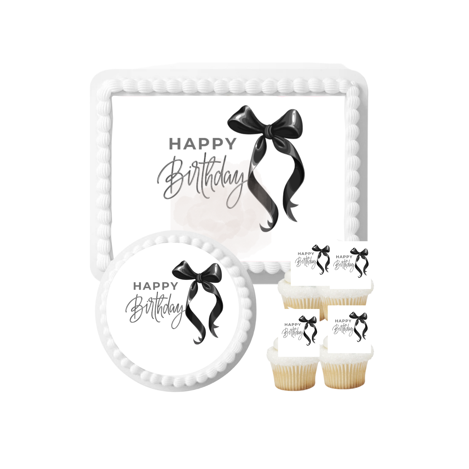 This collection features a classic black satin bow motif accented with soft neutrals, blush, or gold details — bringing a touch of class to your dessert table and decorations. Each piece can be customized with your name, age, or event message for a polished, personalized look.