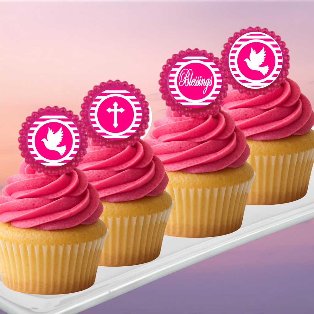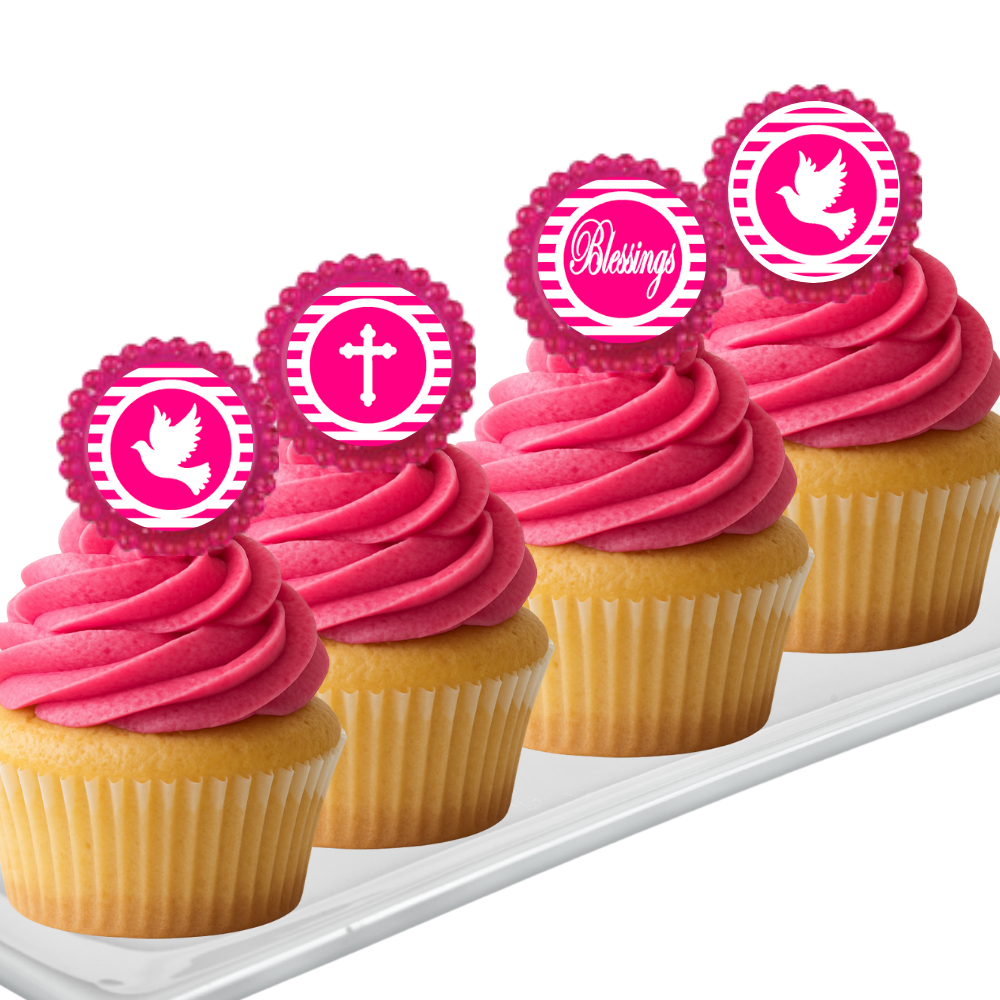 Hot Pink Baptism Christening Religious Easy Toppers Cupcake Decoration Rings -12pk