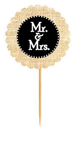 Mr & Mrs Black Rustic Burlap Wedding Cupcake Decoration Topper Picks -12ct
