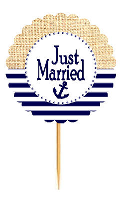 Just Married Nautical Anchor Rustic Burlap Wedding Cupcake Decoration Topper Picks -12ct